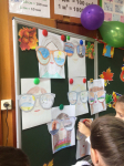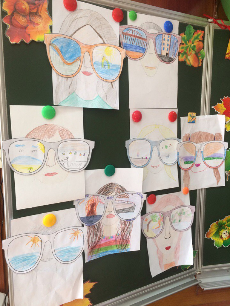 Дети закончив рисовать на очках, приклеивают их на свой портрет, потом вывешивают его на доску.
