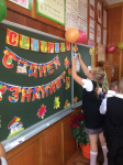 сели за школьные парты. У вас, я вижу, сегодня праздник и у нас есть сюрприз.